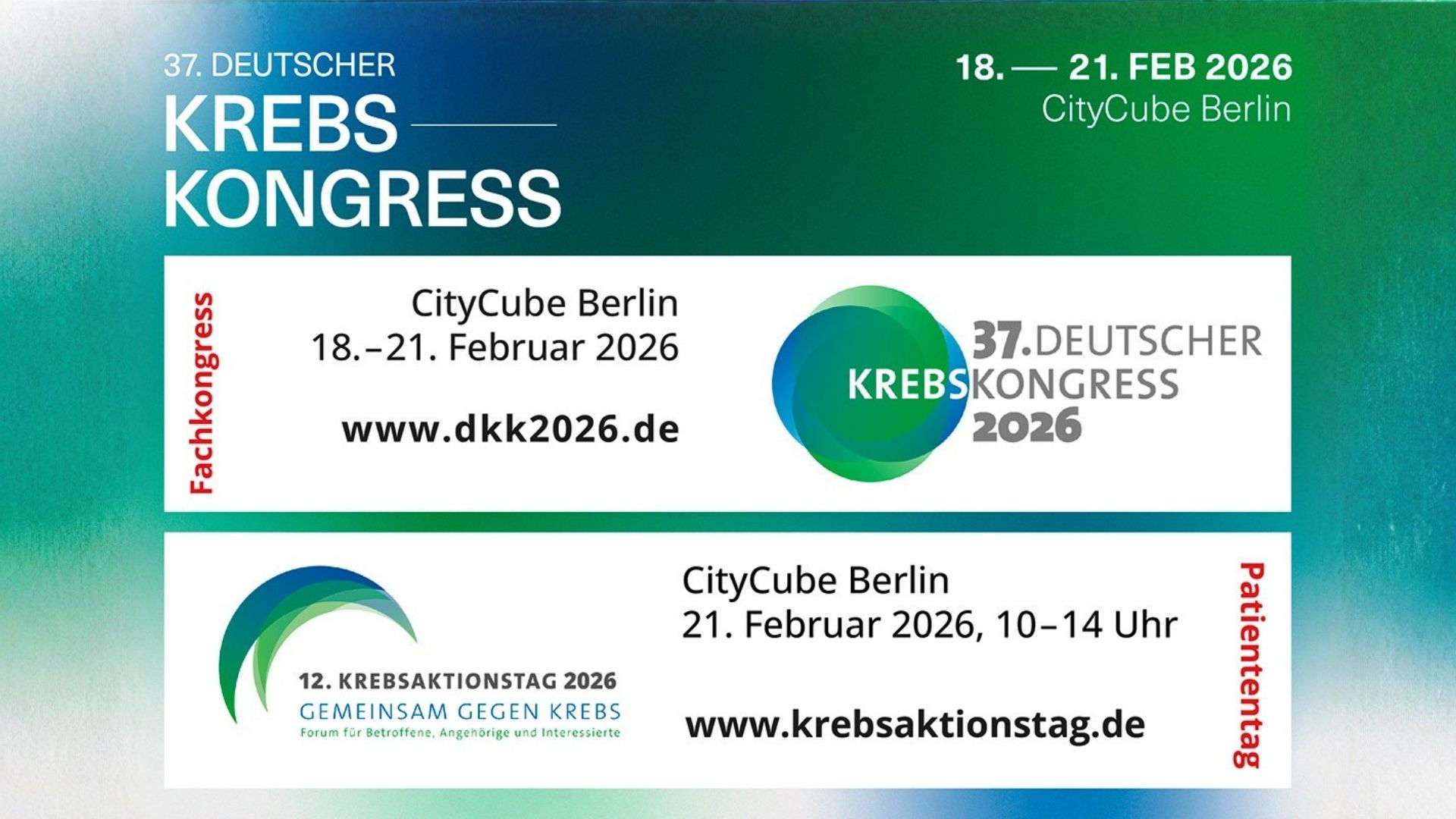 Der Krebsaktionstag findet am Samstag, 21. Februar 2026, von 10:00 bis 15:00 Uhr im CityCube Berlin statt.